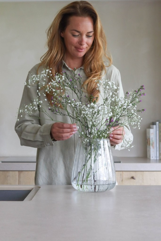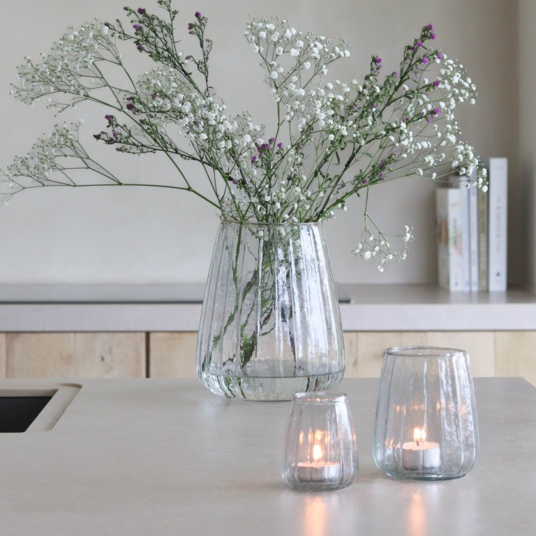 Handgemaakte lantaarn in mondgeblazen glas. Elk stuk is uniek, deze mooie lantaarn is een echte sfeermaker door zijn luchtige verschijning. Deze grote lantaarn kan ook perfect gebruikt worden als mooie bloemenvaas, dubbel plezier dus! Bekijk ook de andere formaten: XS, S en M.